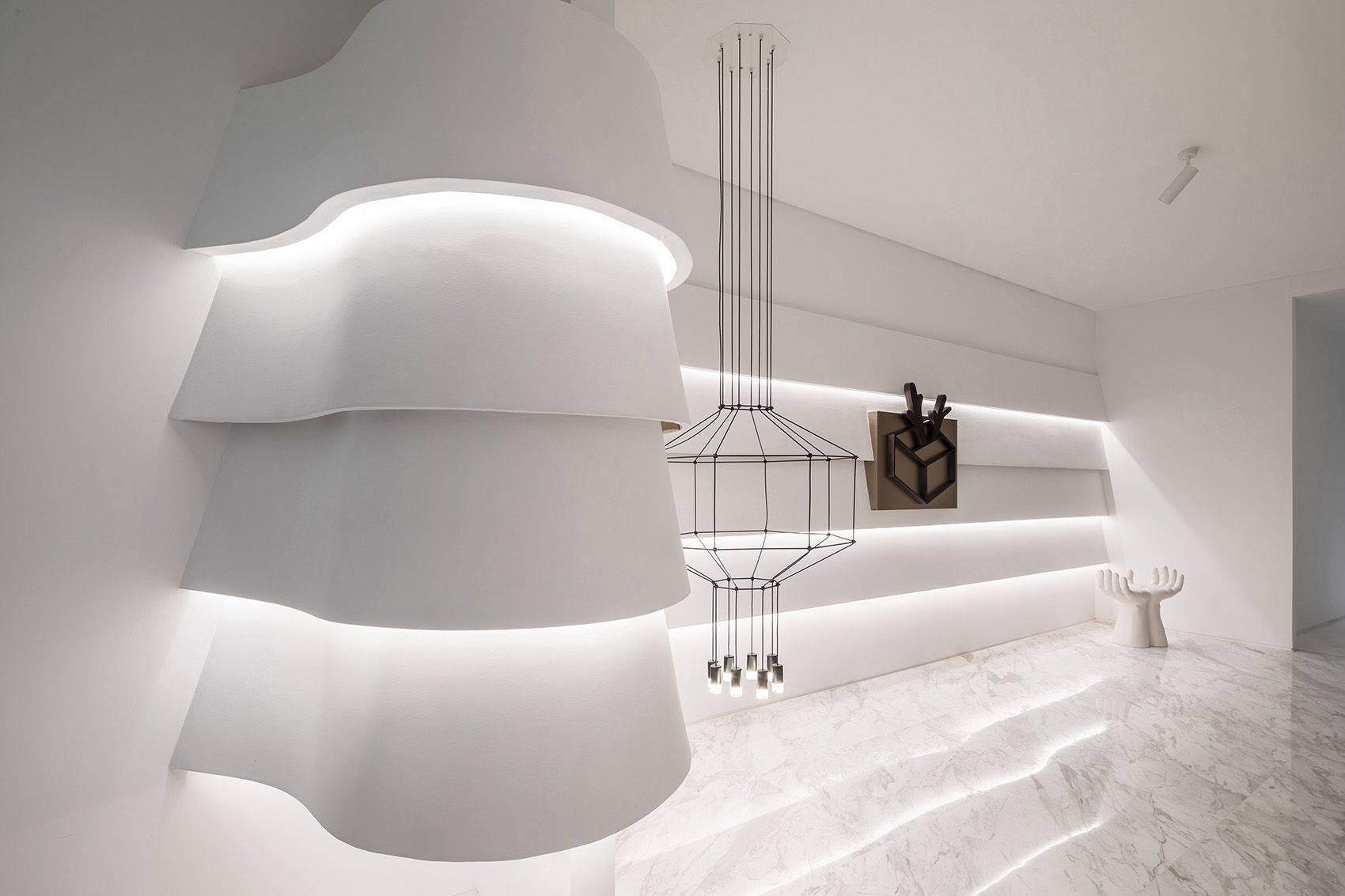 无论是服装还是空间,都需要经得住时间的考验。 走进这间服装品牌办公室,犹如走进一间冥想的场所,白色大理石与乳胶漆的材质结合与碰撞,充满了各种幻想与无限可能。 整个空间的设计理念从一条白色的裙子、月光以及T台延伸而来,空间呈现出极简与清新的感受,与主人的实用主义理念相契合。▼概念区