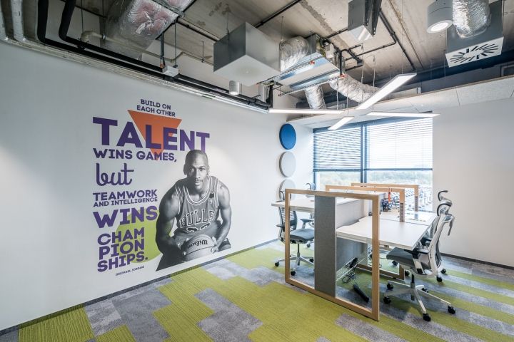 Olx区是一处焕发着色彩和正能量的灵动空间,设计团队就是要打造一个和传统企业形态不一样的空间。创建更多灵动和友好的空间取代传统的办公桌,将极大的促进员工的创造力。从入口区就可以看到具有赛车风的OTOMOTO区。平面设计师Michael Schumacher创作的墙面图形和引用的文字标语彰显了这个富含激情的个性区域。同时采用跑车座椅、赛道照明灯、仿制轮胎轨迹设计的玻璃磨砂等装饰元素,强化这一区域特色。