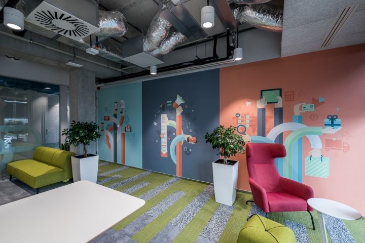 虽然每个区域都各具特色,但却在图形创意这一共同特征下形成一个有机的整体。每个区域都能发现围绕OLX集团的文化所作的原创图形设计、以及著名人物的经典激励语句。