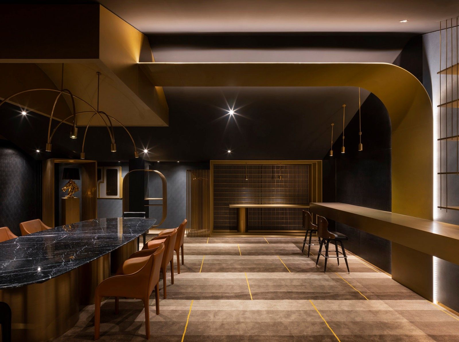 1F: 信步结庐在人境,宴聚而无车马喧林立的建筑群中信步穿行,推门而入,是静谧沉稳的一楼空间。门口大片黑色竹纹板与黄铜材质的几何前台形成自然隔断,围绕金色前台是黑色皮革墙体,粗粝的块石台过渡线条与金属光泽,对冲了细节与材料的精致感。拙朴嵌之现代,线面辅之几何。品茶区,大面积的黑色点缀镂空圆金,枯山水装饰置于其中,空间层次更为跃目。一饮涤寐,再饮清神。品茗深谈,不亦乐乎。▼拙朴现代的空间