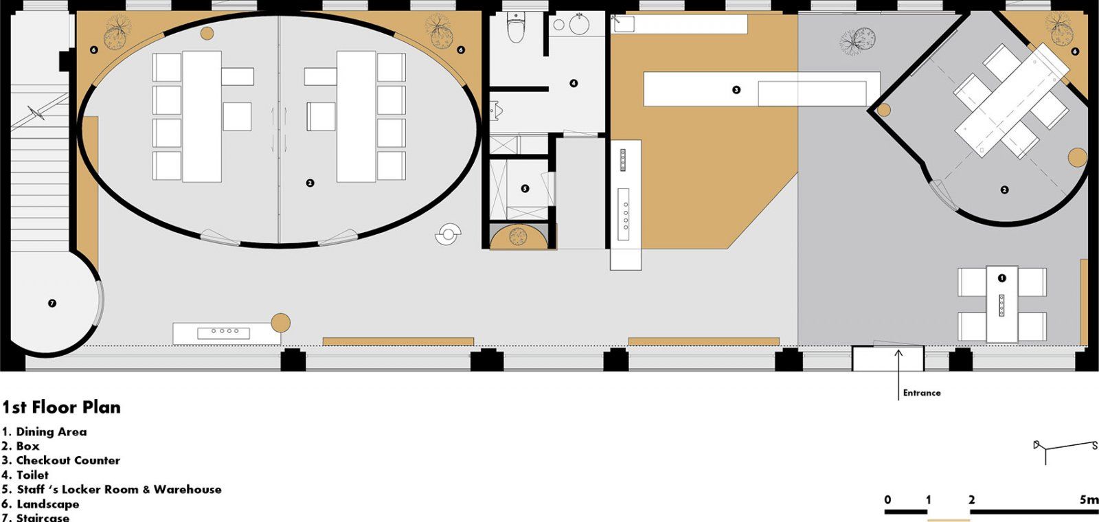 体验感是设计性的本质,视觉化是功能性之衍生从一楼的幽静安适到二楼的惬意畅快,低调隐蔽始终包含其中。在设计感愈来愈丰富的时代,打造一个融合商务与休闲的会客空间并非难事,不易的在于面对见识更多,需求细节的使用者,设计所承载的细节运用与空间节奏上的承转起合。YEBIN DESIGN从洞察者到参与者,尝试更多材料与细节的重组,最终达成商业、视觉、使用上的多重平衡。▼一层空间分析