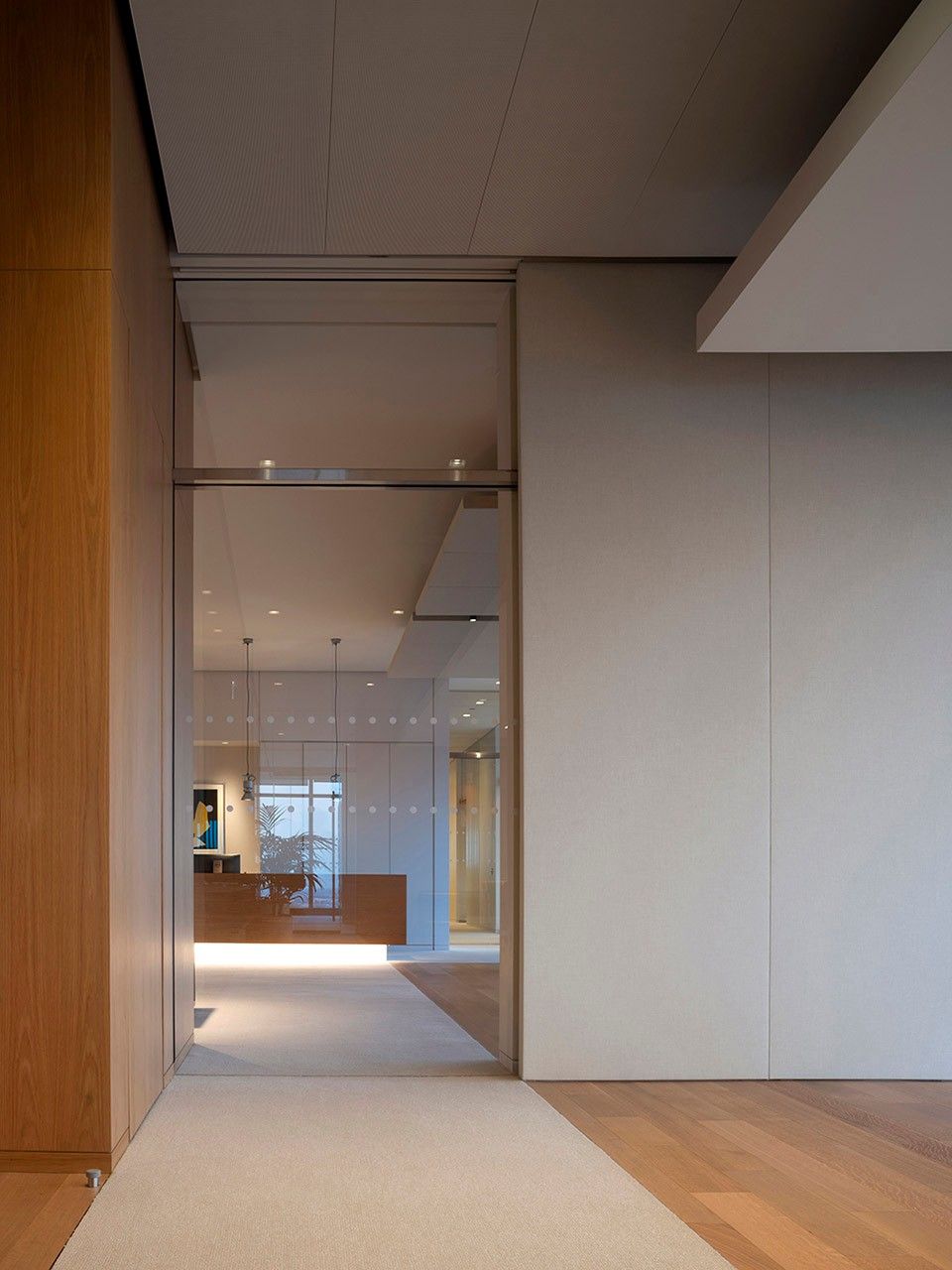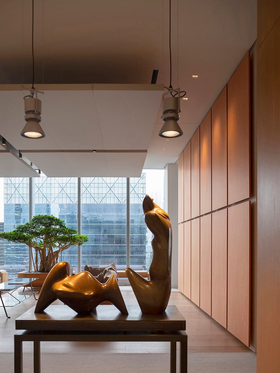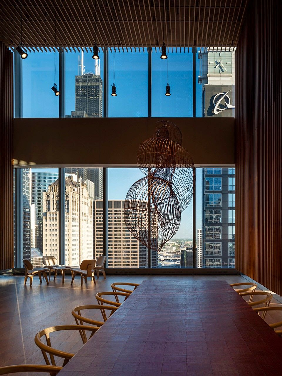 两位建筑师继续描述道:"从弥漫在芝加哥的蓝调音乐的结构中,我们吸取到'张力与松弛'的概念,3.60米高的空间对于办公室来说绝对是不同寻常的,这使得我们能够交替悬挂各种元素如织物面板或者将雕塑元素放置于地板上,形成不同的高度变化。收缩和悬浮的游戏在冬季花园中发挥到极致:一个悬浮于城市上空的独特空间,一个物质与感知的隔离空间,能够容纳音乐、艺术和活动如冥想和阅读。" 根据视角不同,冬季花园的表皮由两排互不对齐的悬垂木条组成,中间夹有的透明玻璃隔断被消解或变得不再透明,产生不同的视角并激活了一个有趣的光影游戏。内部环境如同一个灯箱,允许光线穿透双层遮光和滤光窗帘系统,木条分隔相邻空间。房间布置有日本艺术家Ueno Masao设计的竹子悬挂雕塑和Junko Kirimoto设计的日本漆面桌子。空间具有东方风情,比例合理,符合Alvisi Kirimoto studio的所富有的意大利和日本情愫。