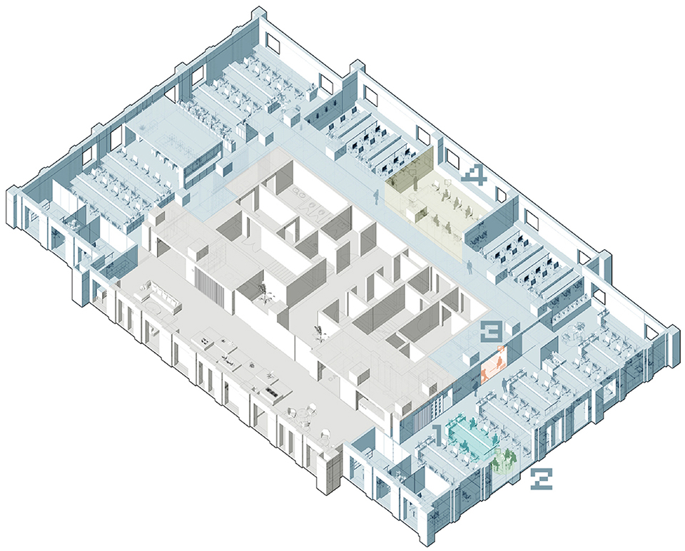 设计打破原本的格局,将更多的开放空间提供给办公者。去除建筑内部承重柱与设备管井以外的轻质隔墙,解放闭塞的隔间,形成开敞的办公环境,满足人数众多的电商部集中办公。