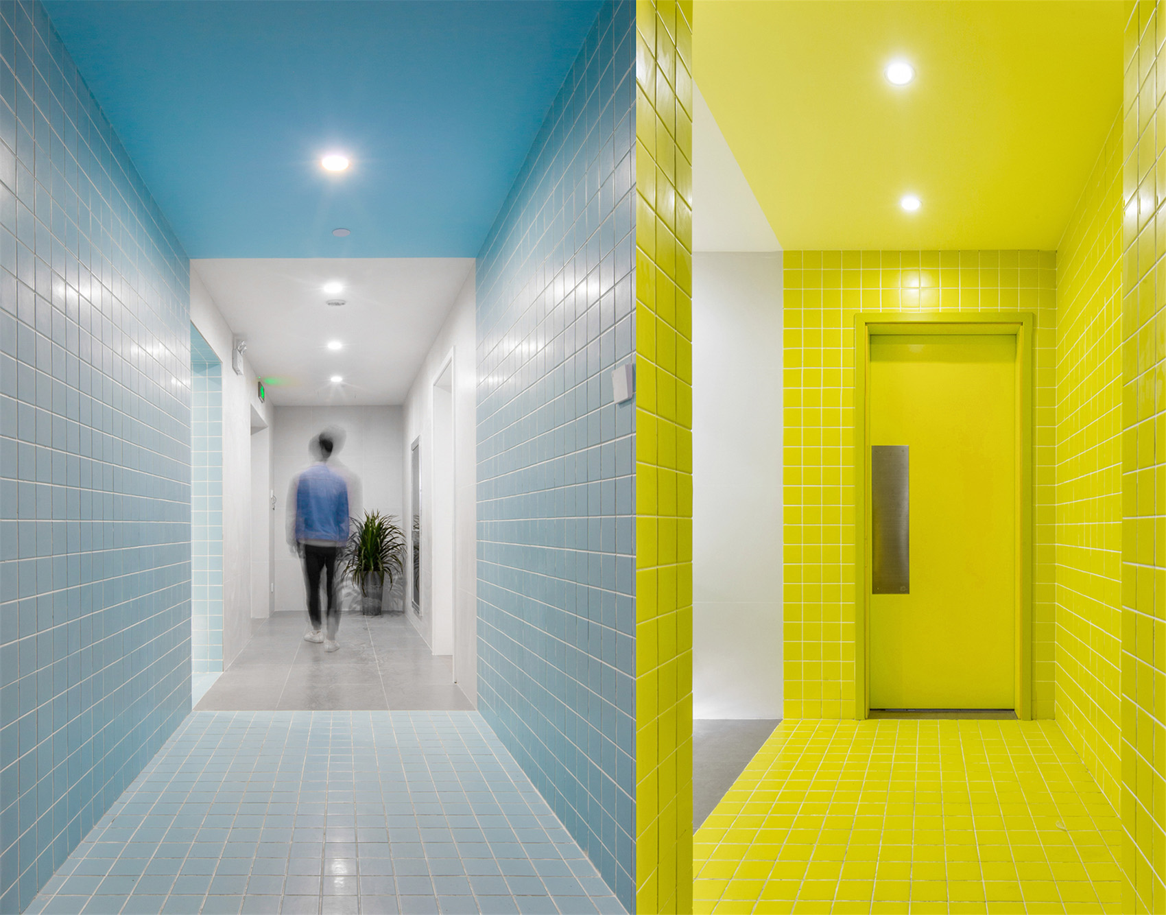 电梯走廊以LED灯带驱赶黑暗封闭的环境,走廊尽头是空阔的多功能区域,可随工作的需求改变室内布局。