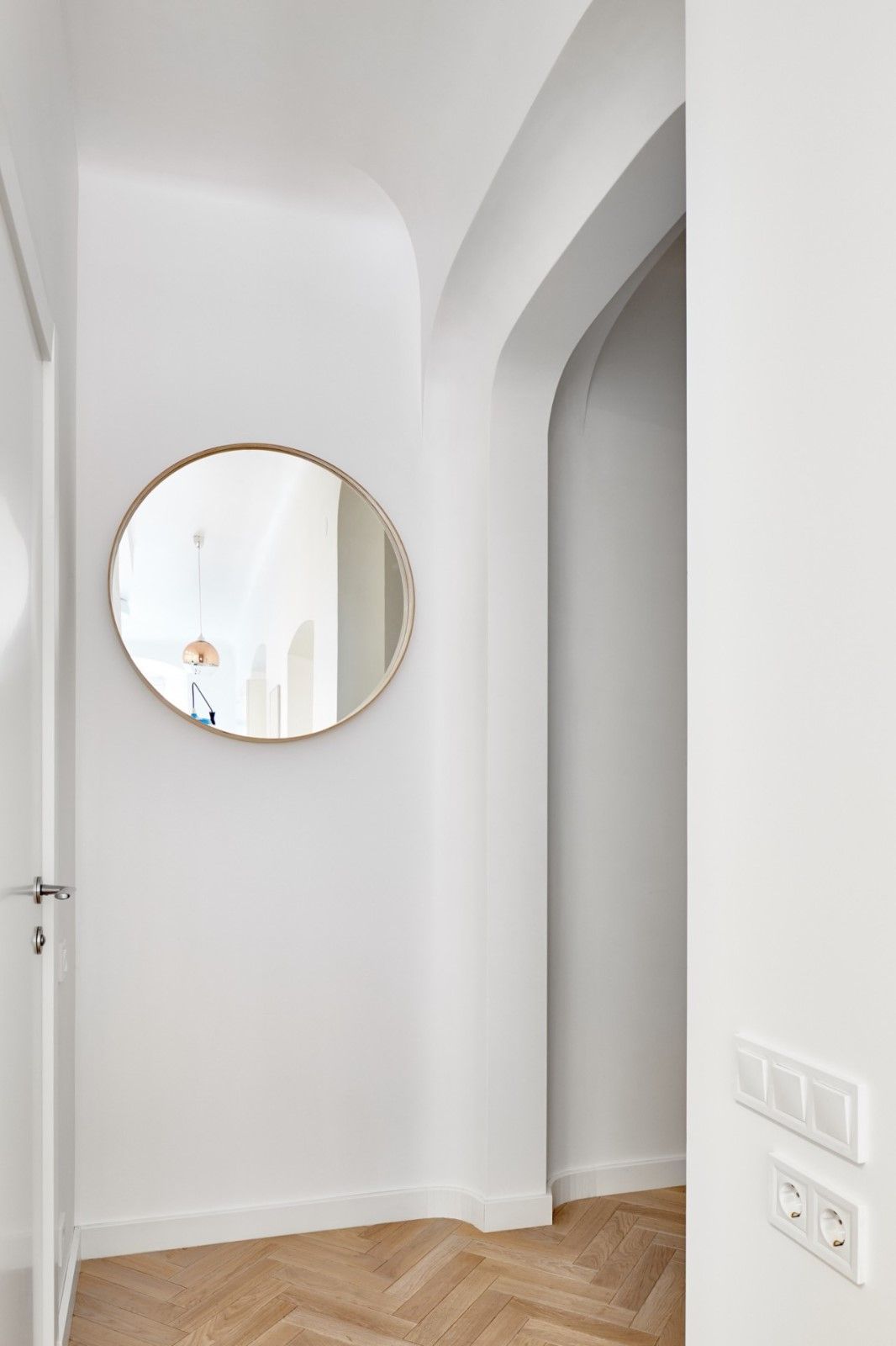 入口玄关白色的墙面,整洁干净弧形天花板,透出一丝浪漫人字拼的原木地板,温馨舒适墙上的镜子即是装饰又有一定的实用性
