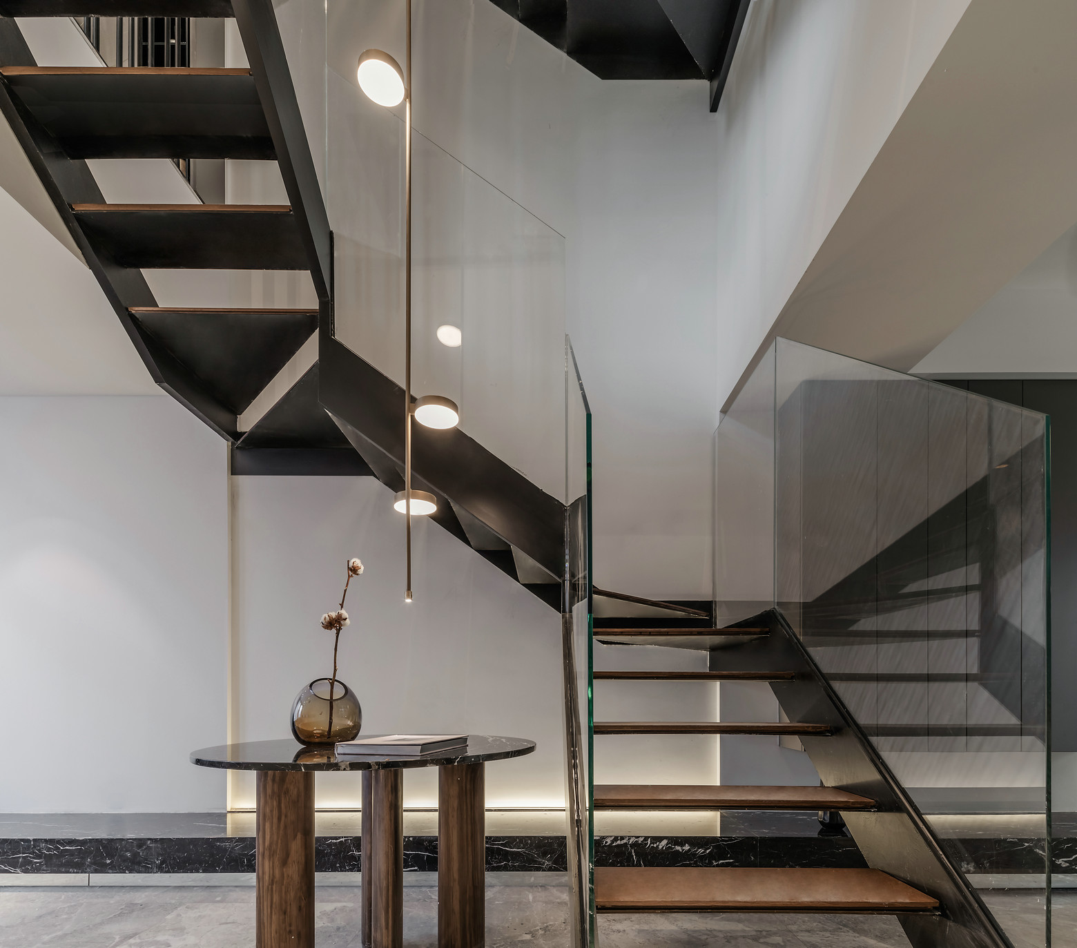 黑色的镂空阶梯搭配玻璃扶手,楼梯中部的线球灯传递着光亮,有利于增加空间的通透感,看似低调的楼梯却能让人印象深刻。