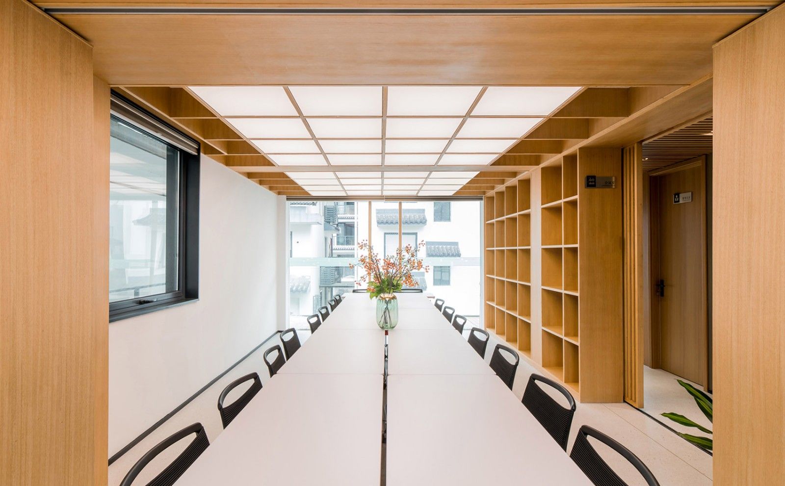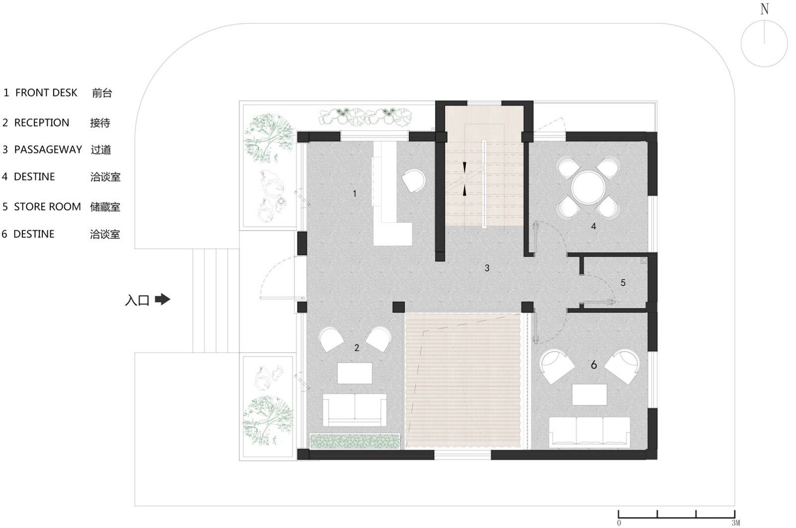 该层处于地下且层高偏低,面对因此存在压抑闭塞,阴暗潮湿等问题,我们选择将一层与二层中心位置的楼板进行了拆除处理。楼板拆除后形成的挑空空间既增强了室内光线又使得空气的得以相互流动,改善负一层的使用环境。另外在此基础上增设了特殊木结构吊顶造型,隔而不断的吊顶造型既能让场域视觉得以穿透,消解负一层因为原本低矮楼板结构带来的压抑闭塞感,又使得上下空间可以有充分的联系和交流。