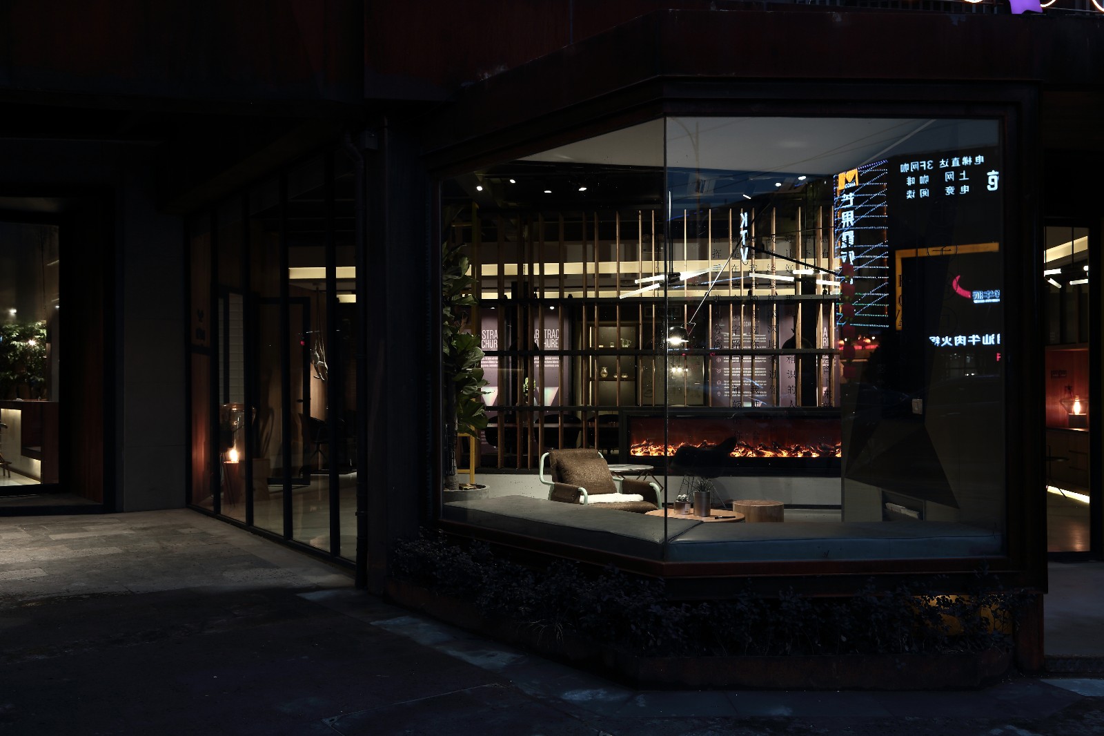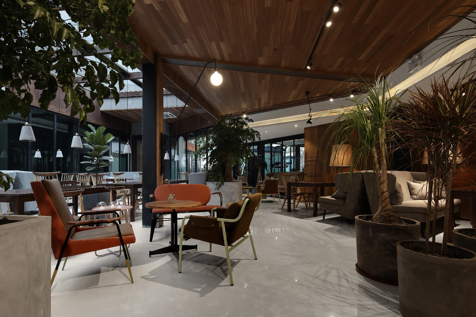 天然木材的中性颜色和巧妙搭配的金属增添了空间的温暖感受。光的巧妙布置不仅照亮了用餐区,也在不经意间把商标展现在人们眼前,强化了品牌。空间本身的直白与简单毫不掩饰的展现出来,通过对青年社区本身功能需求的解读,将私密空间,开敞空间巧妙融合再通透的室内。赋予整间青年社区随意,质朴,温暖的感觉。让每一位来到这里的人都可以像坐在自家的屋里,用一个午后额时光,看着窗外流转的光景,悠闲的享受一次全新的感官体验。在店内随处可见围合在一起的休息座椅。玻璃门外,花园的景致直映眼帘,坐在靠近屋外的座位上,交谈或者品尝美食时还能看见花园里四季更迭的景色。现代化的健身房与用餐的地方形成鲜明对比,流动的曲线,美观大方的运动器材给人耳目一新的感觉。