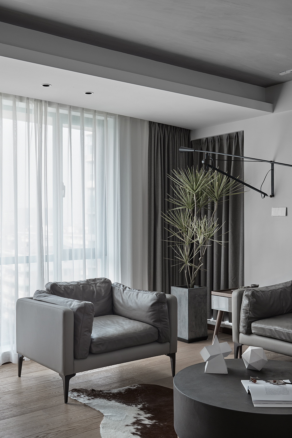 是一对年轻夫妇的全新生活空间,崇尚放松悠闲的慢生活方式,我们将居住者喜爱的利落现代风融入时尚工业元素,营造出舒适个性的居家空间。在原来的功能结构上做了比较大的改动,开放式的空间布局让光线与空气更加自在流通,阳光与自然景色穿过落地玻璃,不论是日出日落或雪景、落叶,让居住者在家中便能享受到无限的美景,良好的采光使白色的墙面与水泥顶面更加透亮,特别值得一提的是电视机背景的“耐候板”,锈迹斑驳的表面有种历史的复古感,从而将‘时间’这样一个无法捕捉的概念视觉化,同时设计师刻意降低了室内的彩度,以素雅柔和的色彩塑造出宁静而清澈的氛围,所有家具线条利落,造型简洁,摆件饰品从木元素,针织品,皮革到金属元素,局部点缀的恰到好处,使空间更加丰满质感。