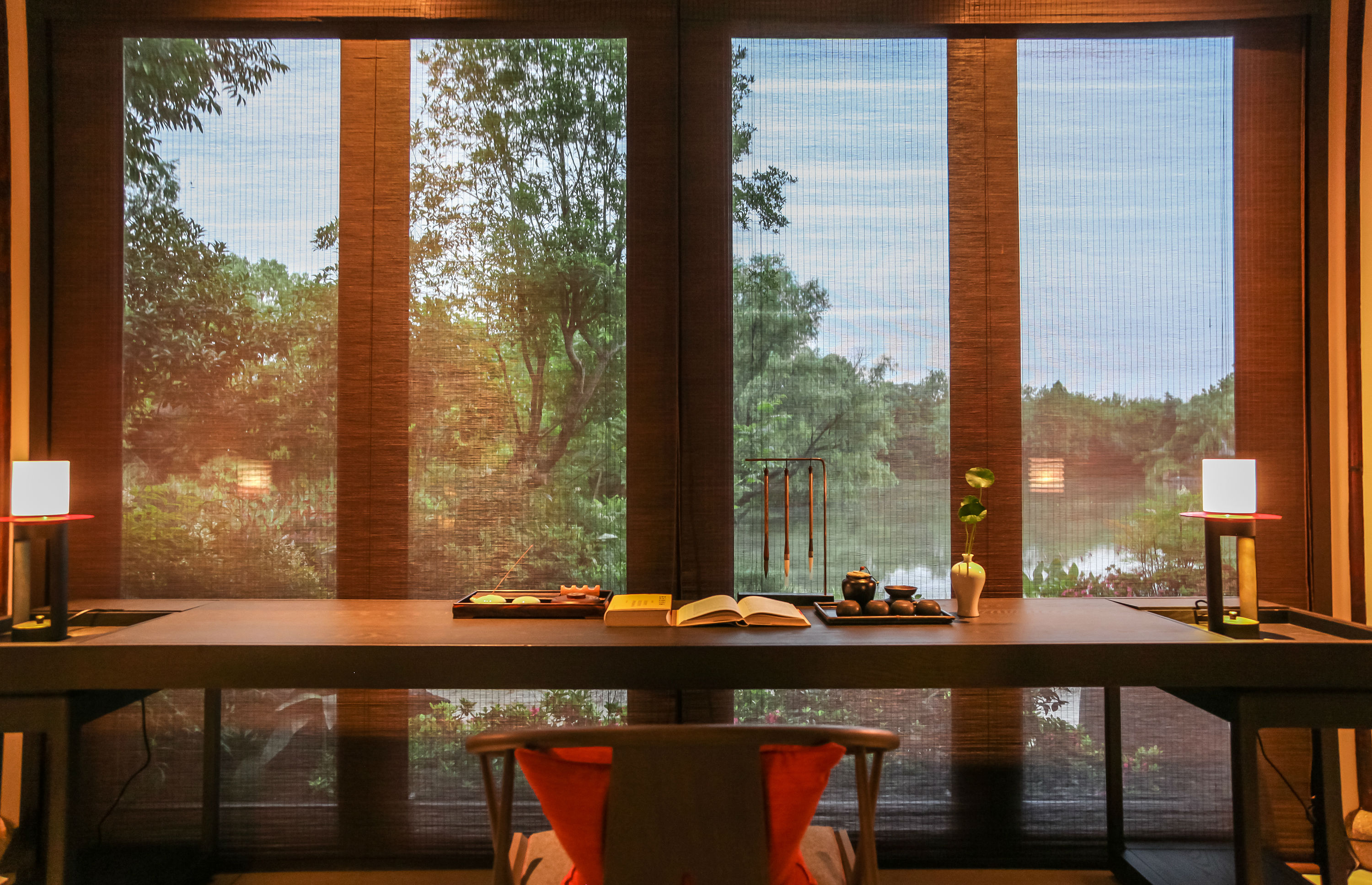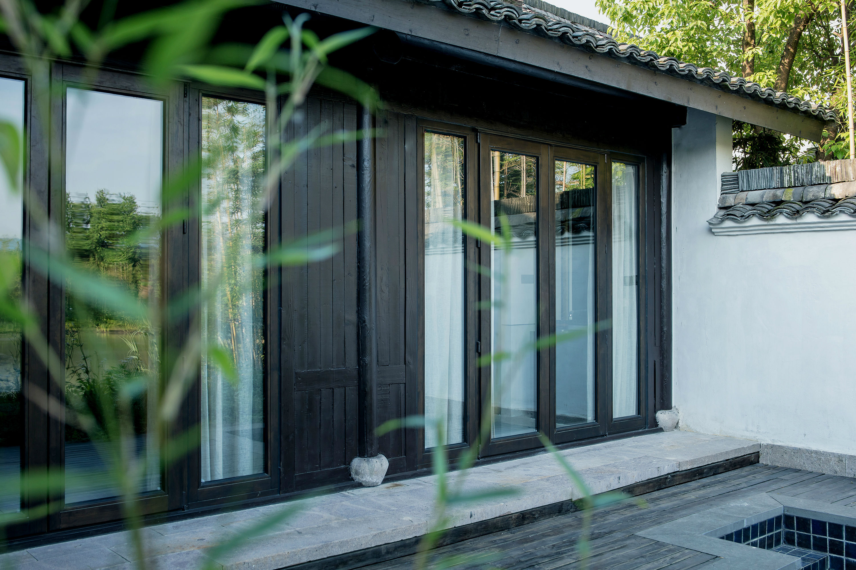 窗,成为重要的媒介。 传统中式的建筑,注重隐、闭,惯以镂空的窗格采光。 在张炜伦的设计视角中,当代的中式建筑,不应因循守旧, 应当传递当代的居住精神,让天光水色,满盈室内,无处不在。 她在设计中,以大面积开窗面打破了建筑的闭合感。 框架结构与明朗玻璃窗,将室外的水云天,与室内闲逸之心,融为一体。     卡纳设计 - 所见西溪度假酒店| - 9