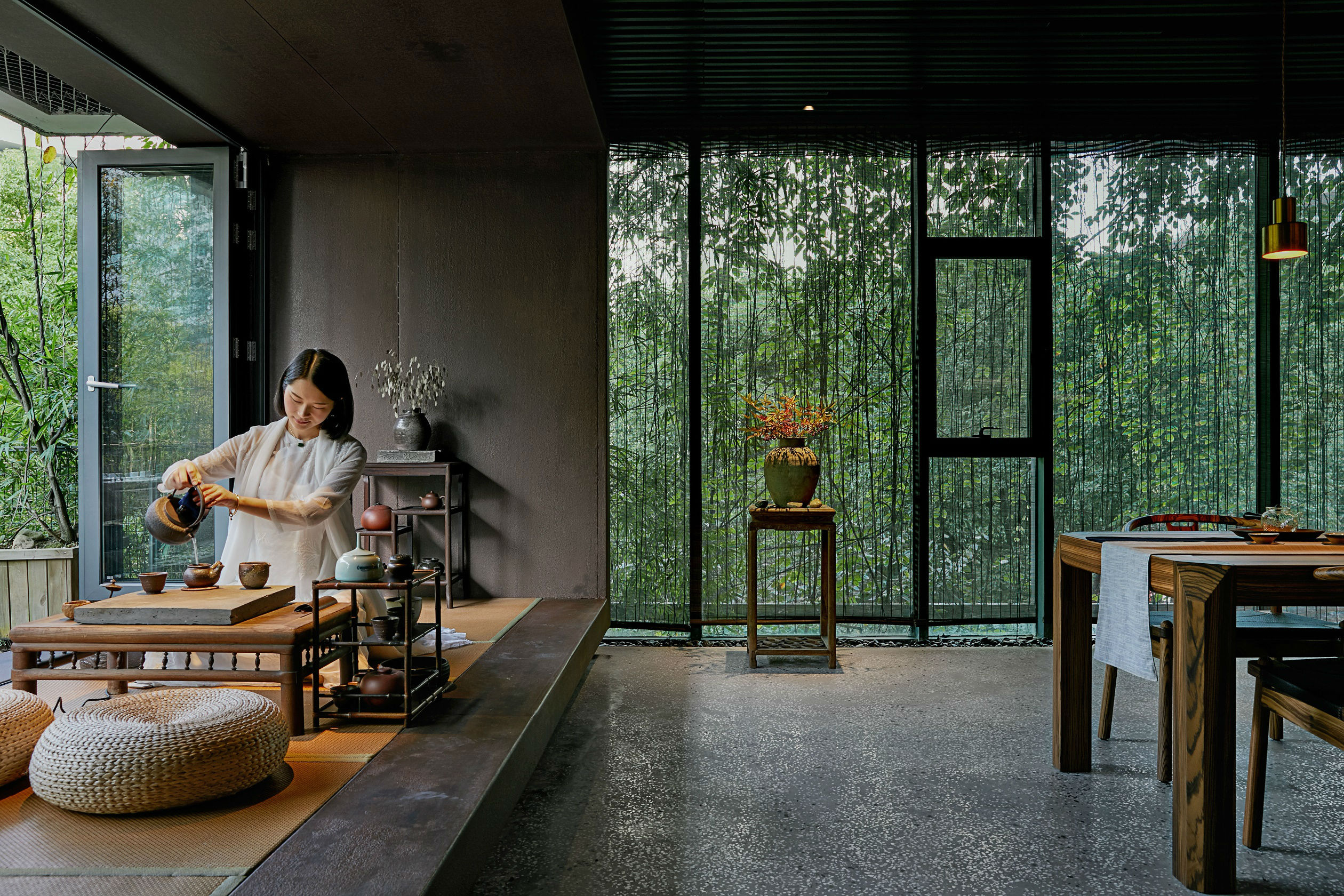 设计师把一个方形的铁盒子置入茶舍和露台之间,取代了原先的封闭墙面,通过可以完全打开的折叠门,完成这个空间的延续。于是,从茶舍进入露台的经历又添惊喜——穿过空间的过程多了榻榻米式的茶室,静谧而又灵动,一个开放空间一个封闭空间,在形成室内外对话的过程中,绿意,阳光,氧气和匠心亲密的融合在了一起。     天慧装饰设计 - 慧舍| - 9