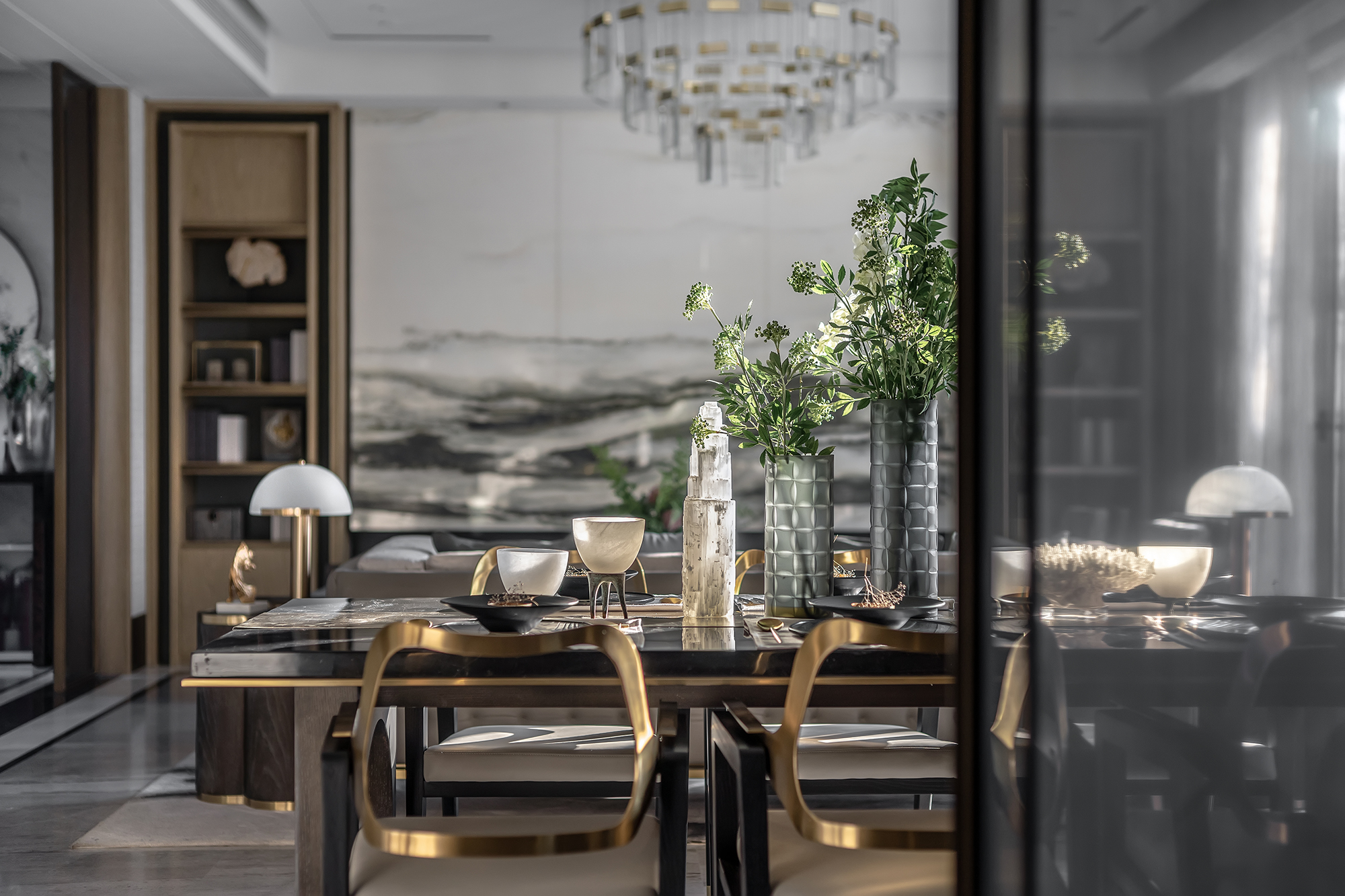 餐厅配合着极简的设计构思, 色彩上以沉稳的黑、华丽的金为主色;看似随意的一把绿叶,如清风徐来;雅白如玉的饰品,演绎出东方文化的清雅韵味。 空间中,材质的混搭与精致的工艺形成一场精心的铺排,餐桌上花艺的介入让空间形成去物质化的诗意,呈现雅静风清的舒适感。     布鲁盟设计-济南新城玺樾别墅| - 12