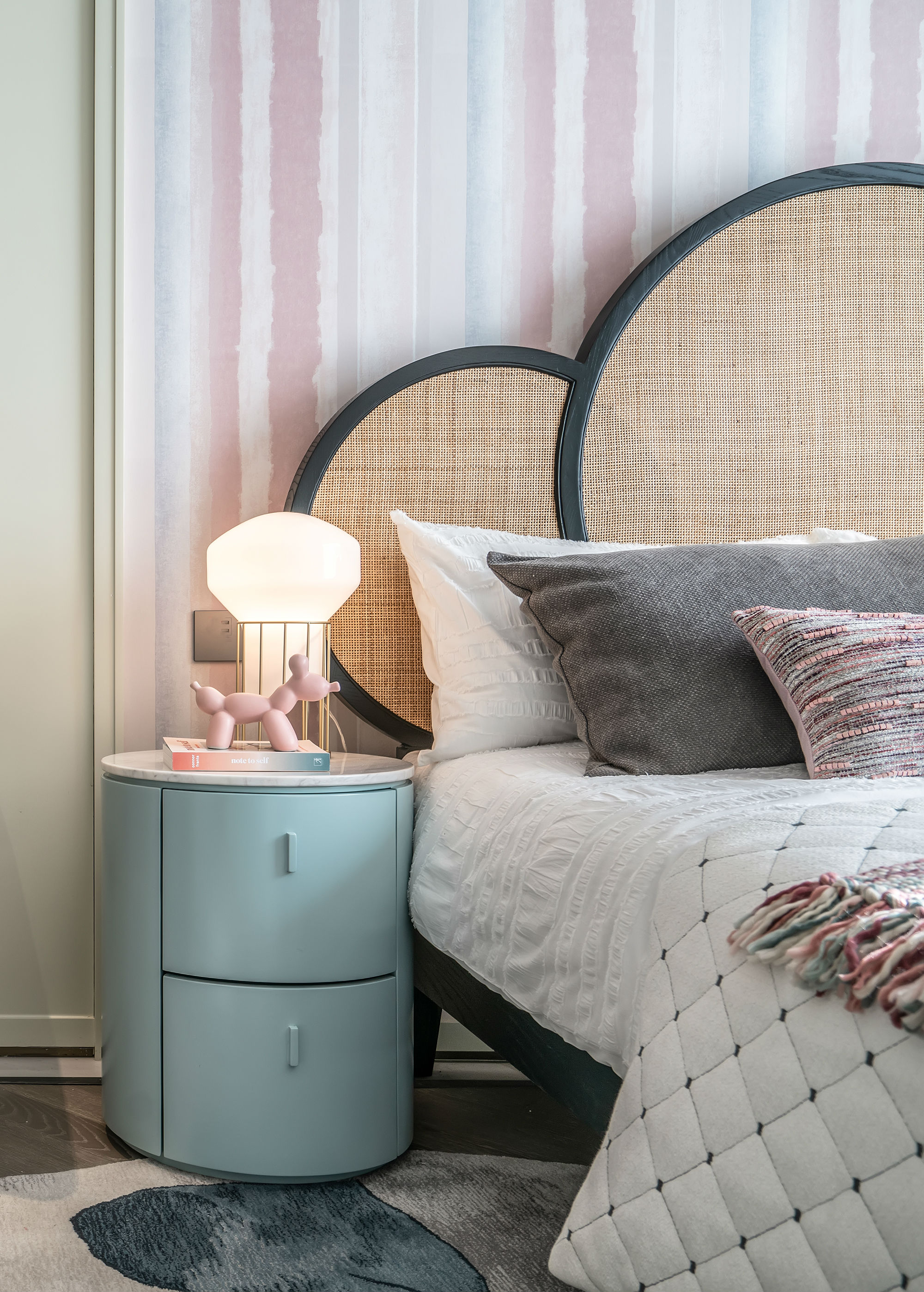 不同主人的卧室空间,均以营造静谧为前提,用不同程度的灰色糅合现代风尚,在内敛与品质之外,融入东方元素。 步入主卧,床头背景墙上,一幅水墨画营造静中之境,剔除琐碎的装饰,与特殊定制的床头与边柜形成呼应,简洁的形式、柔和的线条,清寂的装饰,不同材质与肌理的碰撞,让人不觉漫游在传统与现代交织的艺术世界。     布鲁盟设计-济南新城玺樾别墅| - 19