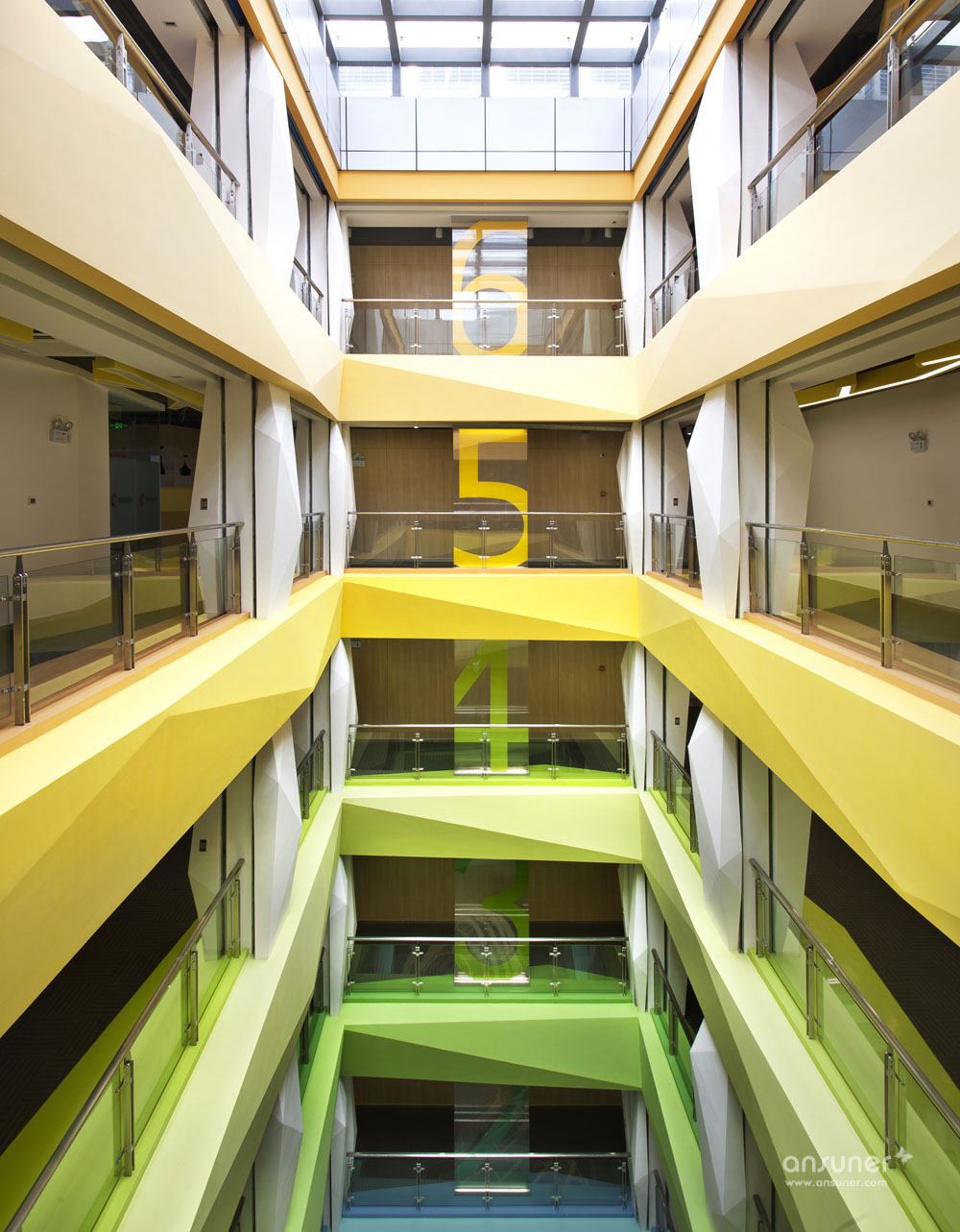 B6栋楼的设计理念以折纸、飞翔为出发点,在建筑内部空间用全新的表皮形态语言,以卷动的形式呈现了“透与轻”的属性并在空间内动态地延伸。新的肌理以“点线面”为形式语言,通过实体的空间形态呈现。灵动的空间布局展现出一个装载着创业者梦想并加速启航的开放平台。