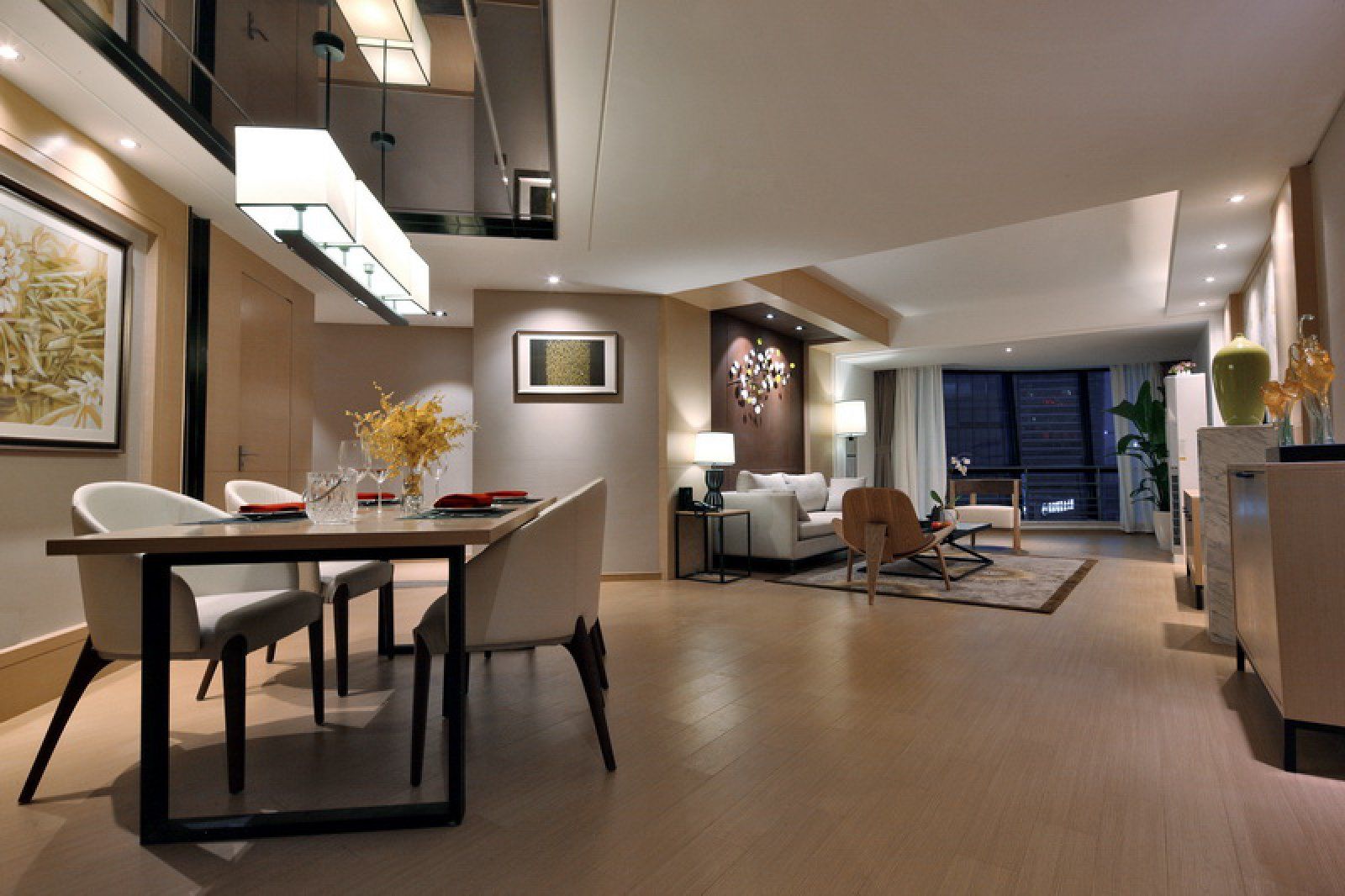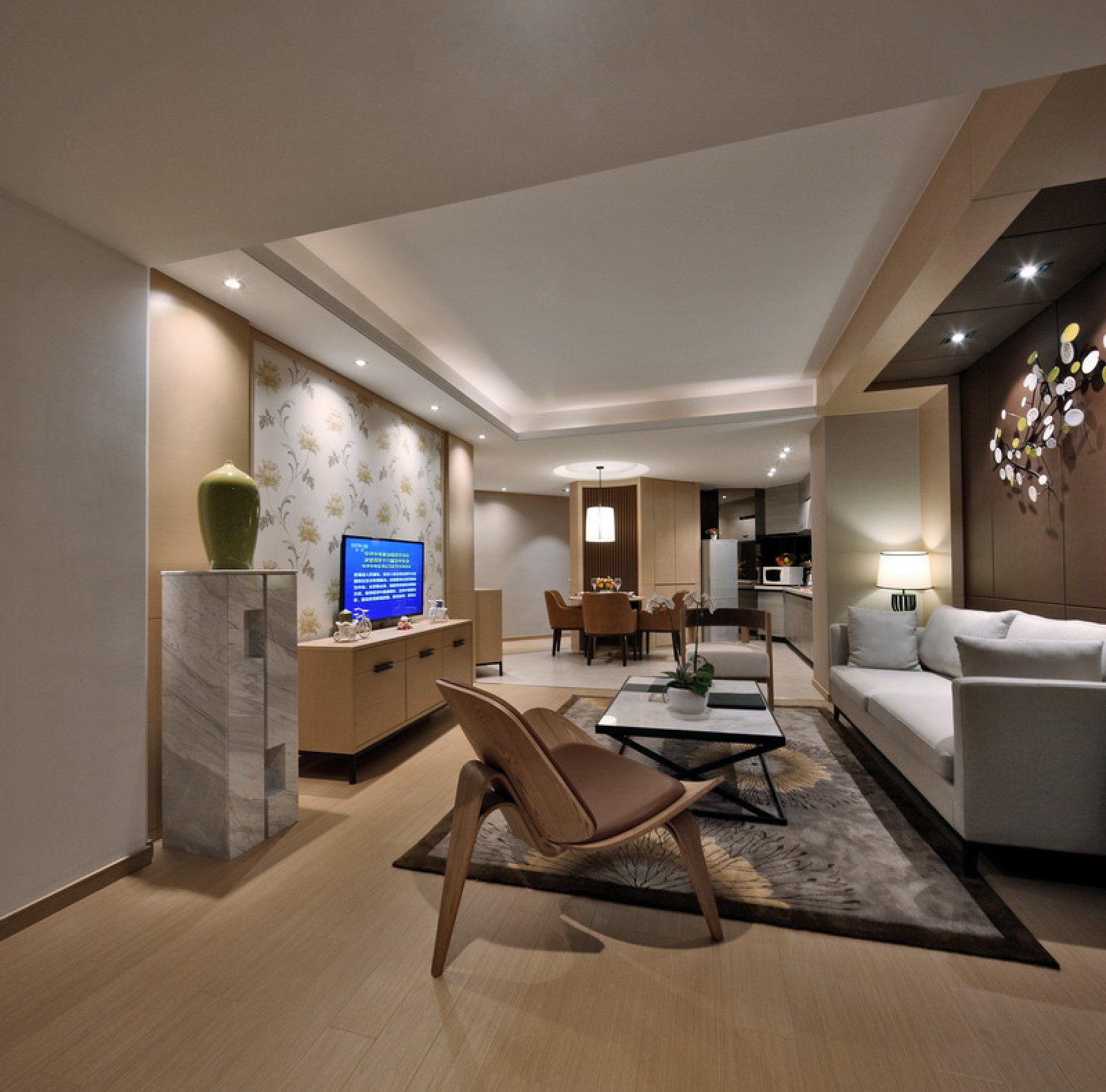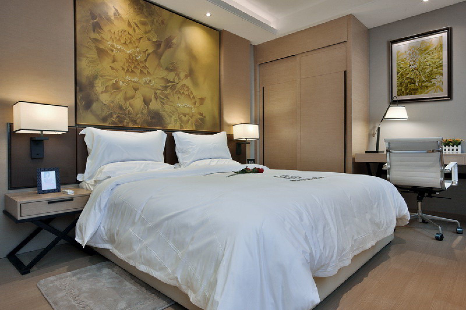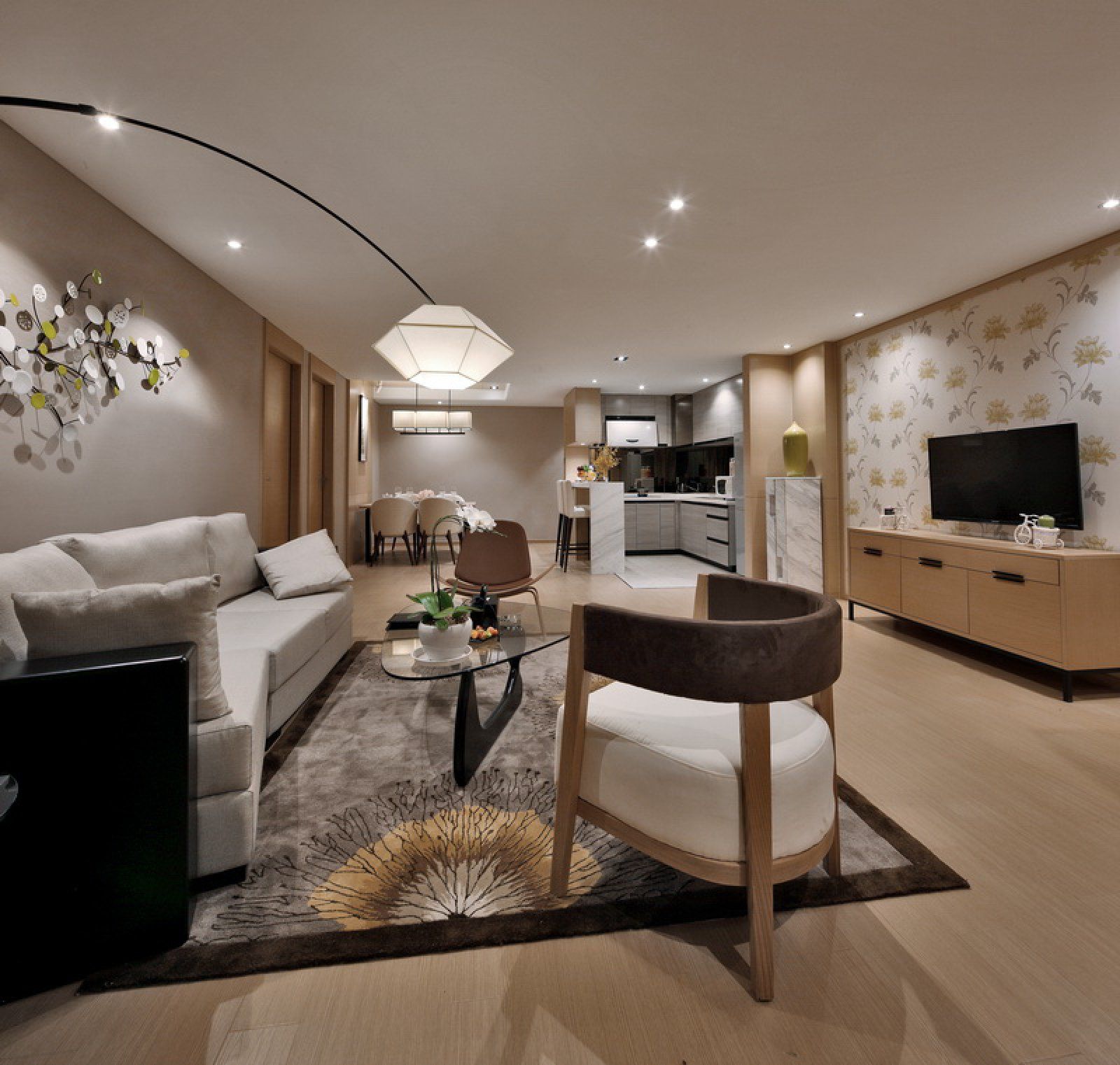 酒店一层大堂的设计采用绽放花朵的图案为设计起点,以“花开四季”这样一个美好的主题展开故事序列。用虚实相生的手法破解庞大结构柱与承重墙所带来的空间压迫感。整个公寓在设计手法上简洁、有序,顺应原建筑结构改造,曲直相生、乱中求整,以随性而不过度修饰的纯朴设计手法表现整个空间的层次。公寓标准层由四个不同结构的房型组成,硬装设计体块完整、主次分明,清新淡雅、轻松闲适是设计突出“自然、回归”理念的重点所在。不同房型,通过浅色木饰面、深色镜面和灰色系墙纸的穿插运用,突显了居家、温暖的空间体系,软装设计的“花意”深化了“花开四季”的美好。整体色系都控制在暖白色调中,力求空间保持在清新雅致的调性中。在材质运用上,多采用细腻有质感的材质纹理,以拉近人与自然的亲密距离,简单但不失精致。运用自然元素的设计主题贯穿整个空间,通过花形元素的运用来传达空间的艺术张力,使整个空间在具有视觉冲击力的同时又保持了艺术审美的和谐感。