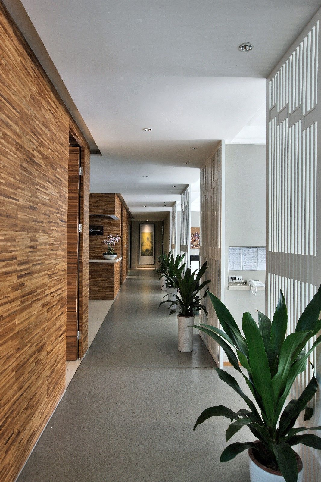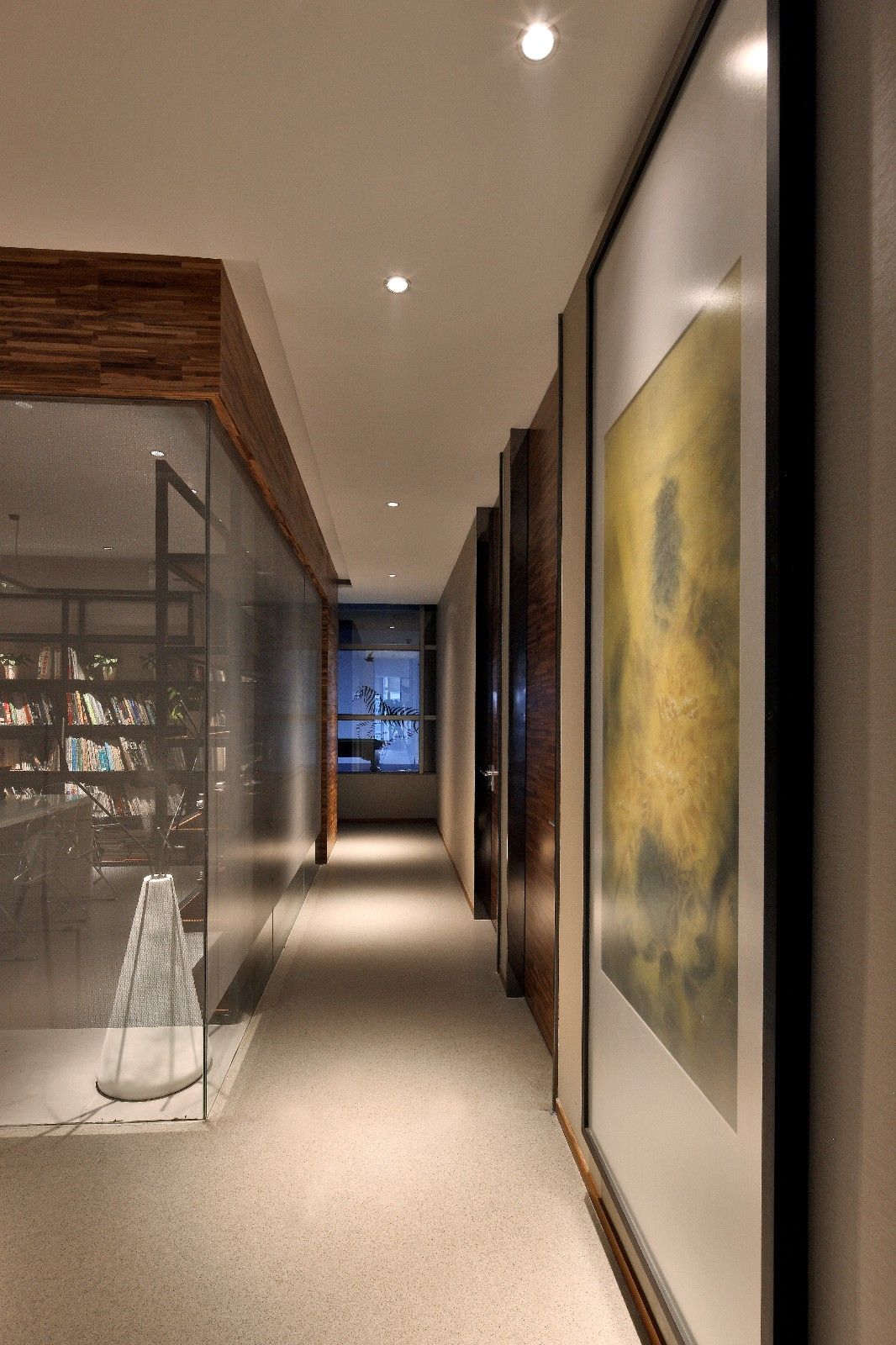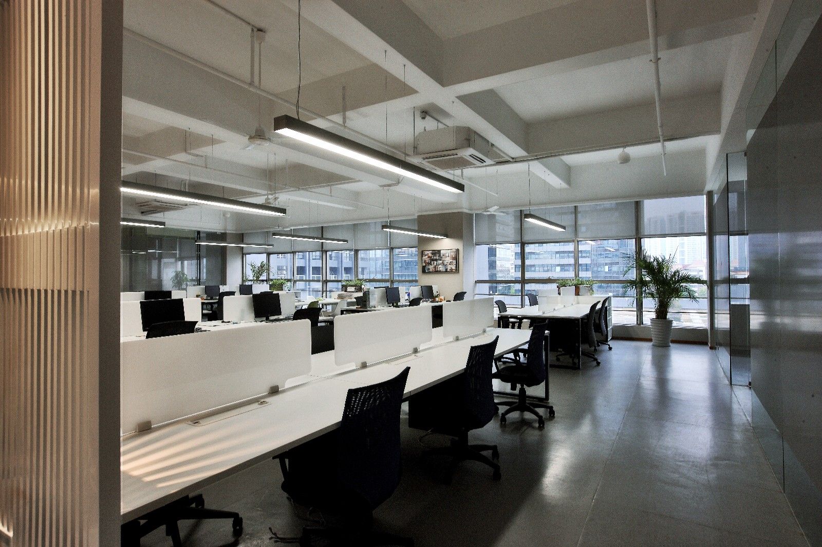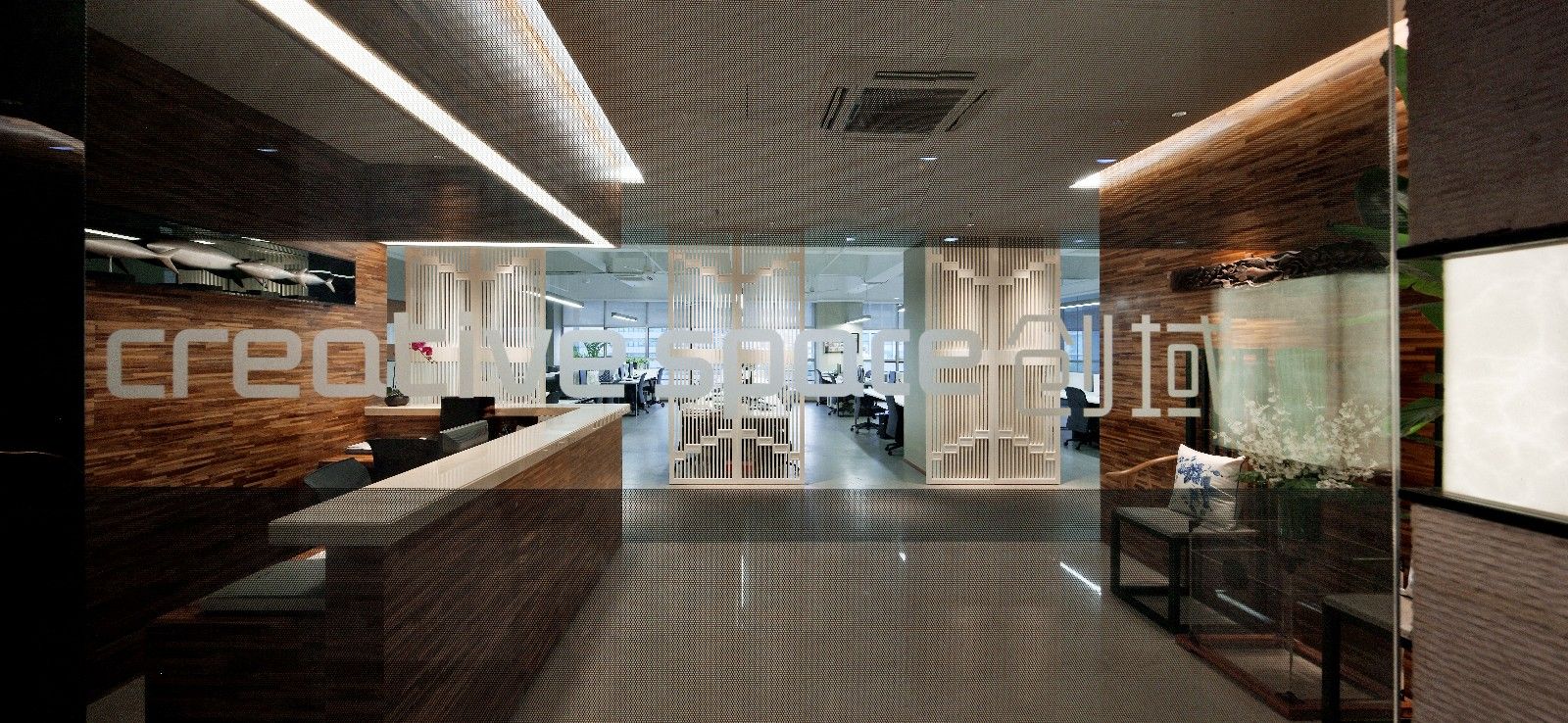 这680平米的空间在图纸上横着竖着看,不也就是几个标着尺寸的方方正正的“盒子”嘛,但是想想我们一天会有多少时间在这里度过呢?你就越发的觉得这里不单是工作场所,是企业的一面镜子,更应该是充满情感的场域。虽然笔下的硬装、软装,一旦实施,你爱或不爱、你看或不看它就在这里,但是我更愿意它们所构筑的场域能把那些心底的喜怒哀乐和快意人生都静静的表露出来。这是一个两户打通的空间,方正、通透。进行功能布局并无多少踌躇,空间布局和灯光营造反而是打造的重点。大楼走廊橙黄的灯光透过公司磨砂玻璃门,把门上镶嵌的公司LOGO斜斜投射在入口玄关的大理石地面上,一切的游走便从这里开始:接待区的工作台和背景墙由指接板饰面,深浅相间的棕色木纹提高了空间感知的温度;而相对的另一边则见整墙上横挂着一付晚清门楣构件,乌木色的雕工细细的刻画着云纹卷草,下摆一对中式高背靠椅,一箱方正的亚克力透明茶几上跃动着簇簇艳黄的虎跳兰,寥寥几笔勾画出的这组中式小景立刻彰显出空间的人文基调。一条横向的走廊在布局上分隔了接待空间与办公区域,二幅珍藏版的云南画派原作在走廊的两端遥遥相对,点射凝聚的那束光照亮了一朵朵由黄白绿濡染出的莲花、绣球花,几分水墨淋漓、几分恍若梦幻、又有几分高雅恬静,细致婉约的继续演绎空间中的人文气息与东方神韵。几幅间隔有序的镂空白色喷漆屏风在走廊边把接待区与办公区自然隔离,“线与面”的组合运用是贯穿中间开敞式办公区域的主要设计手法:白色的工作台在空间中整齐排列,天花造型简单干净显露出结构美,悬浮的线型吊灯增加了视觉层次。