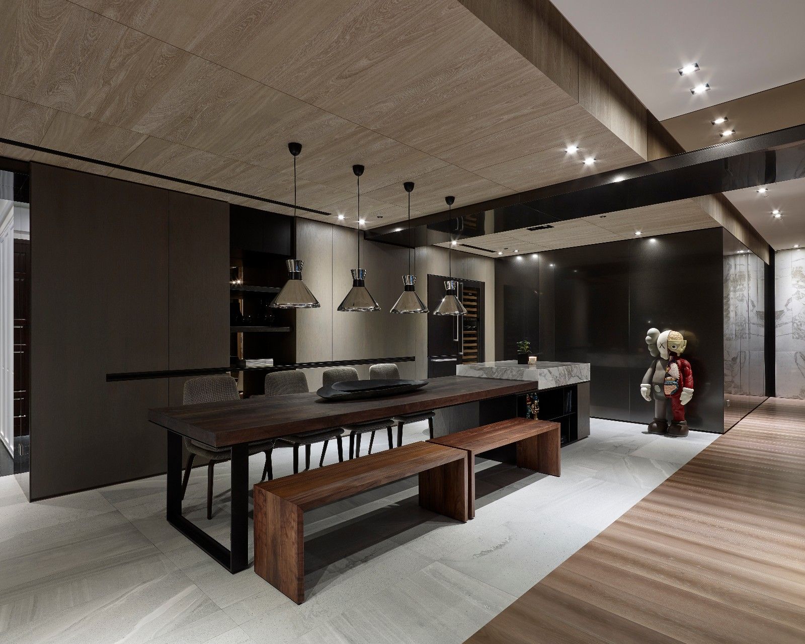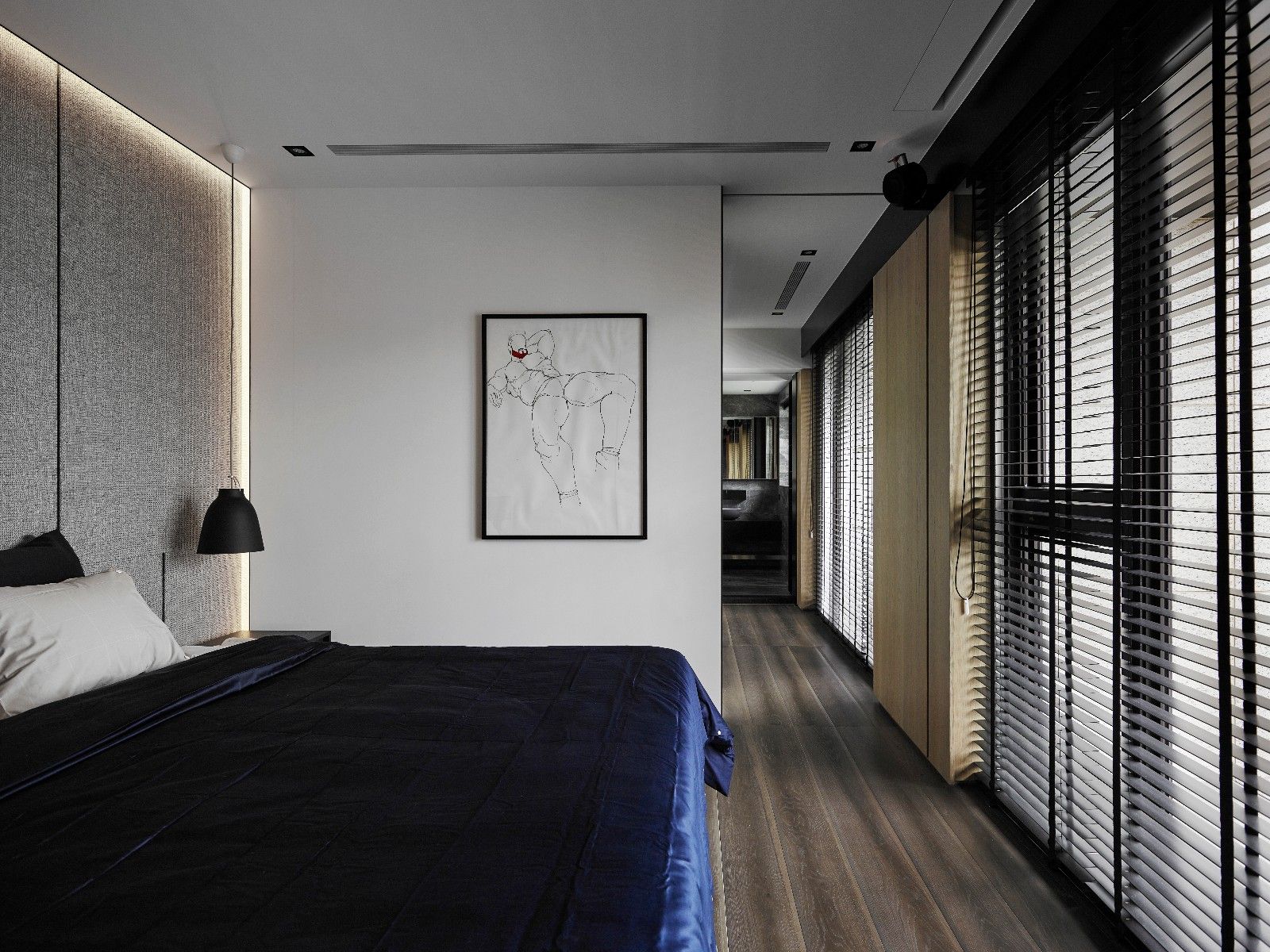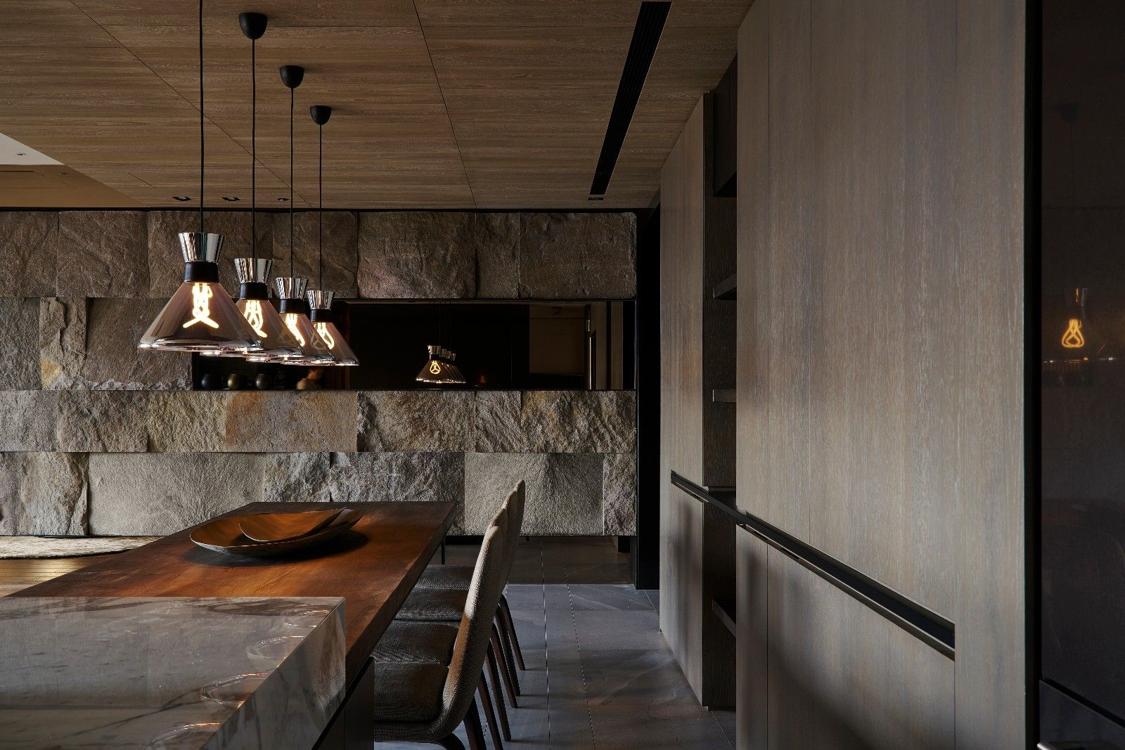 搜模型材质的语汇界定空间的量体 对比量体错层堆栈沉稳与律动相互交融线条贯穿延伸平衡空间重量 -场域界定置入两空间量体使开放场域自然而成,以材质线条与灯光分界空间量体,增添原本一分为三的空间场域,形成另一独特区域。 -量体划分空间一分为二,一边以单一素材建筑手法延伸空间深度。另一边以材质渐变方式减化量体的存在感;暗喻空间的界定,错落的光跟影让空间本质交错流动。 -引光入室光:主空间在规划上运用基地条件,采用垂直动线;引光入室。影:延续性空间,灯光透过材质错层散布在空间之中,反射的光跟影,营造空间趣味性。 -质空间以石、木润色镀钛包覆量化空间透过反射性材料,延续材料本身的质;因反射交叠,传递空间多变的生活面向