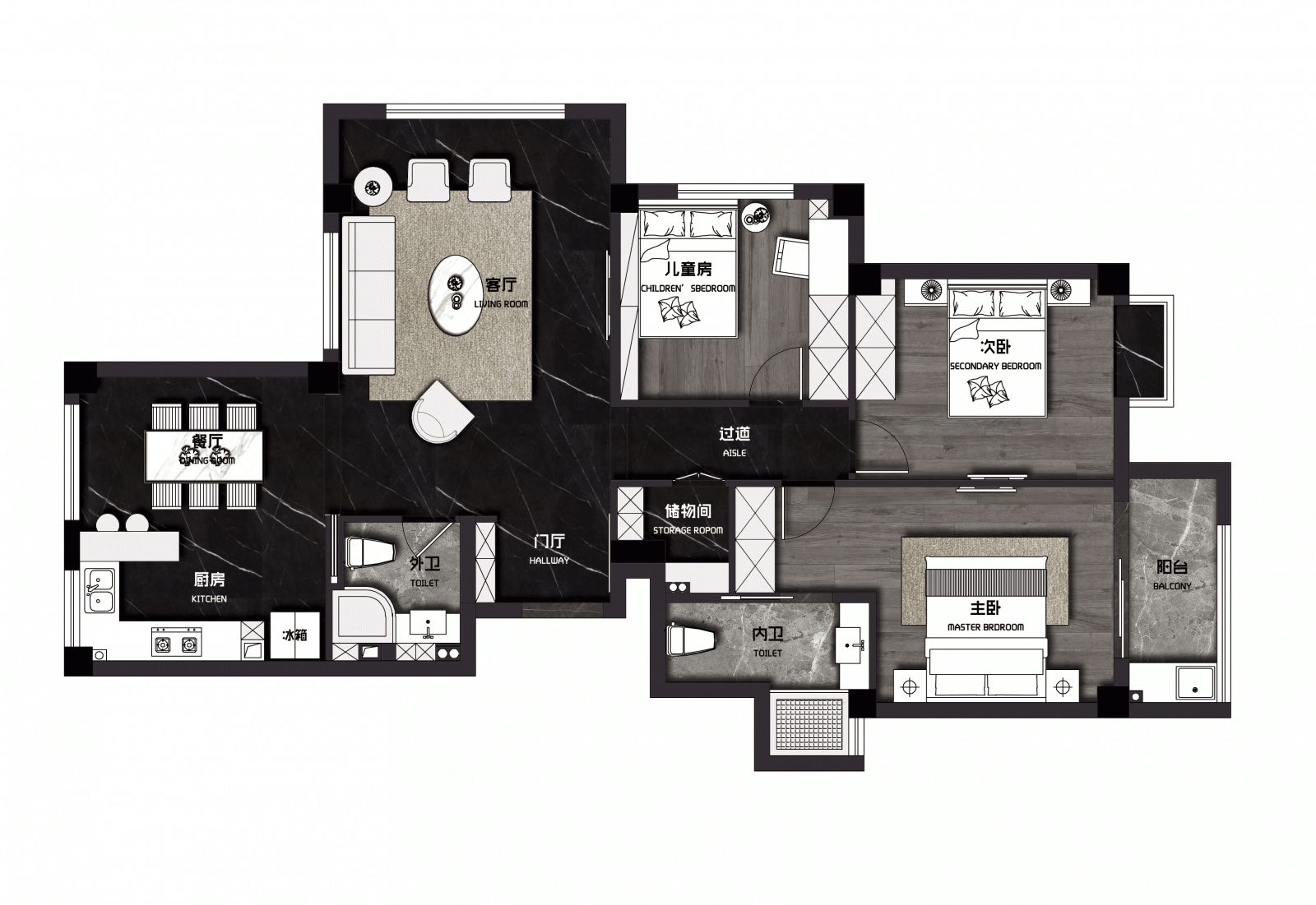 3.考虑到目前需要三个房间,业主未来也不需要独立的书房,我们就将书桌与其中一个次卧做了融合。即解决书桌问题,又不用另辟一个房间。